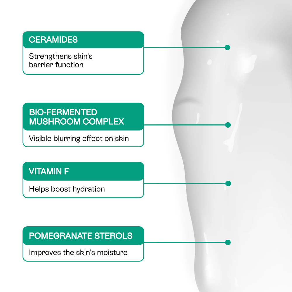 - Proprietary Moisture Barrier Repair Complex of vegan ceramides, pomegranate sterols, and vitamin F: Our patented blend heals and strengthens skin’s barrier, preventing dryness and irritation.